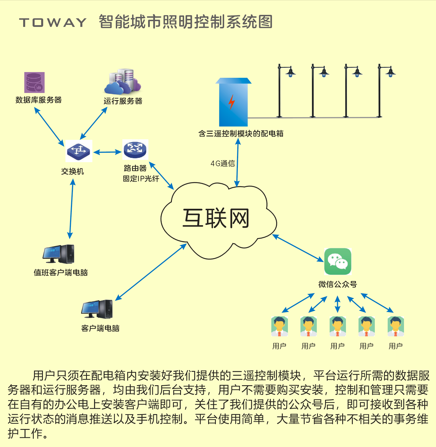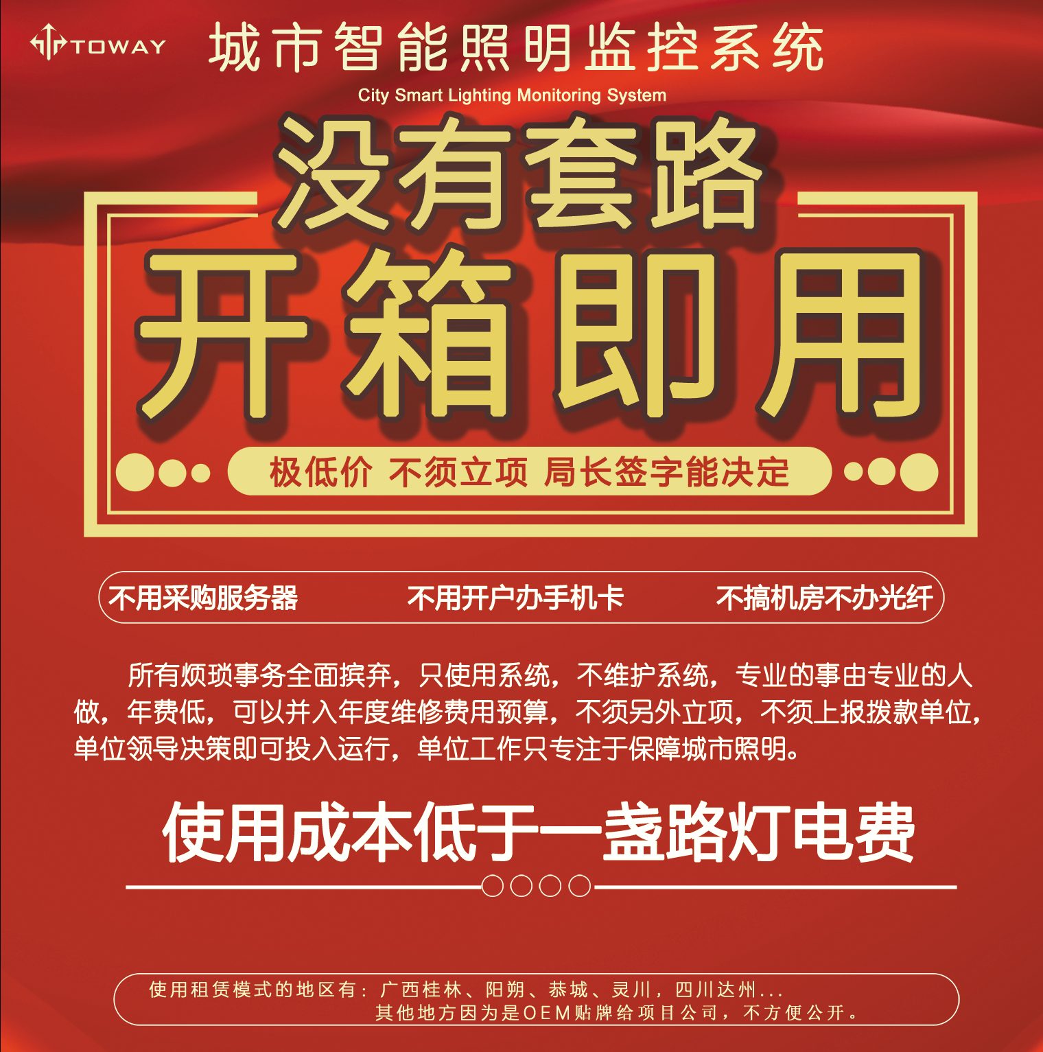 此方案對于一個縣城100臺路燈配電箱的體量,首年開支也只有三萬五千元,此后每年費用是兩萬五,本方案最大的優(yōu)點就是費用低廉,這筆費用完全可以并入年度維護撥款中核銷。且不會有設備過保要重新采購的問題出現(xiàn)。
